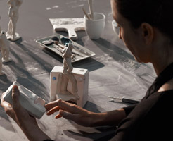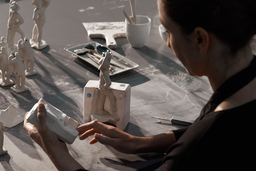 Twomey has positioned multiple unpainted, rather rough iterations of these characters in various “narratives” – dramas of dance, destruction, love, violence, failure and celebration – within a 14-by-14-metre “frame” on the Gardiner’s dimly lit floor. A visitor circulates the Lilliputian contents as he would the perimeter of an Italian piazza. Mounted on separate lofty plinths, are the exquisite Leda and the two male companions Twomey used as source models. To their north there’s a table covered with moulds, tools and powders where weekdays until exhibition’s close on Jan. 4 artisan-performers will quietly make additional Harlequins, Scaramouches et al. for installation.